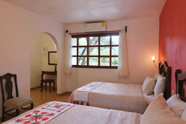 Eleva tu descanso desde la tranquilidad del tercer piso, donde la brisa de Xilitla recorre la terraza compartida. Esta habitación se convierte en un mirador sereno, ofreciendo una perspectiva panorámica de la exuberante naturaleza que abraza al hotel, la refrescante piscina y la cálida atmósfera de Papan Huasteco. Un espacio acogedor y luminoso, perfecto para quienes disfrutan observar la sutil vitalidad de los jardines desde las alturas.